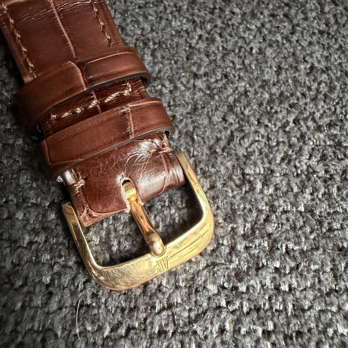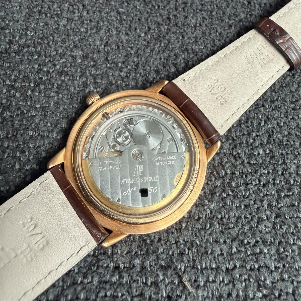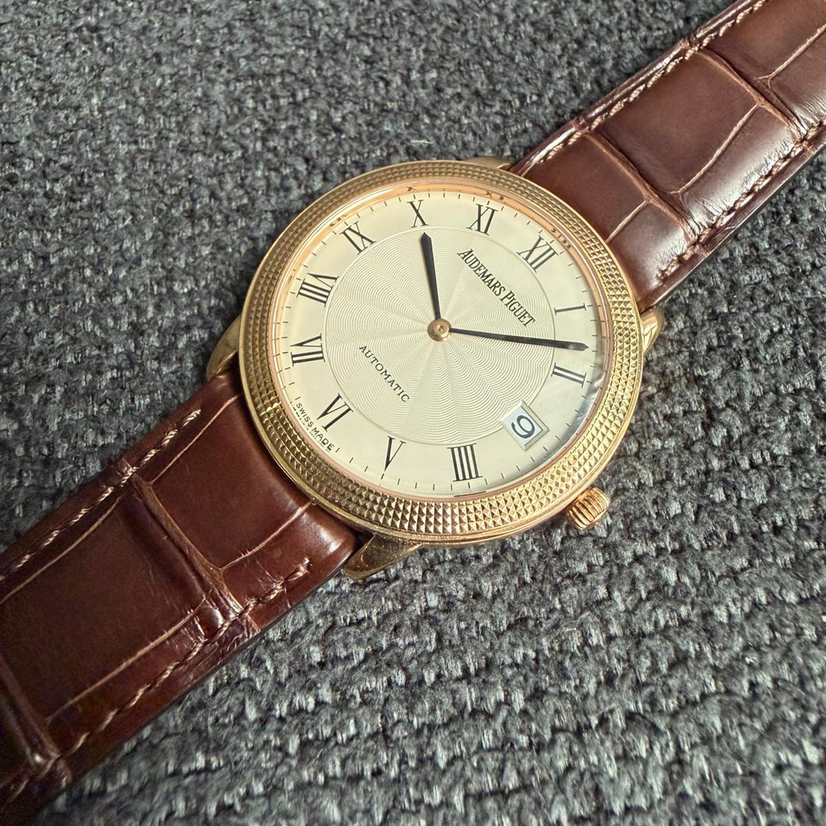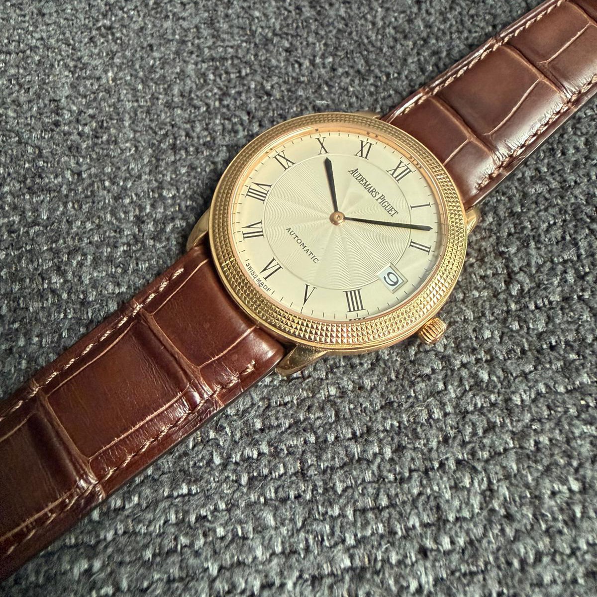Comes with an AP 18k rose gold buckle on a brown croc skin strap.